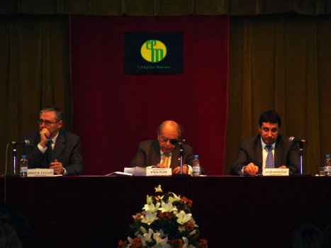 El director de l’escola, Pare Taulats, el M. Hble. Sr. Jordi Pujol, “padrí” del projecte i Lluís Gonzàlez, president de l’AMPA, escoltant el discurs d’en Jaume Moregó.